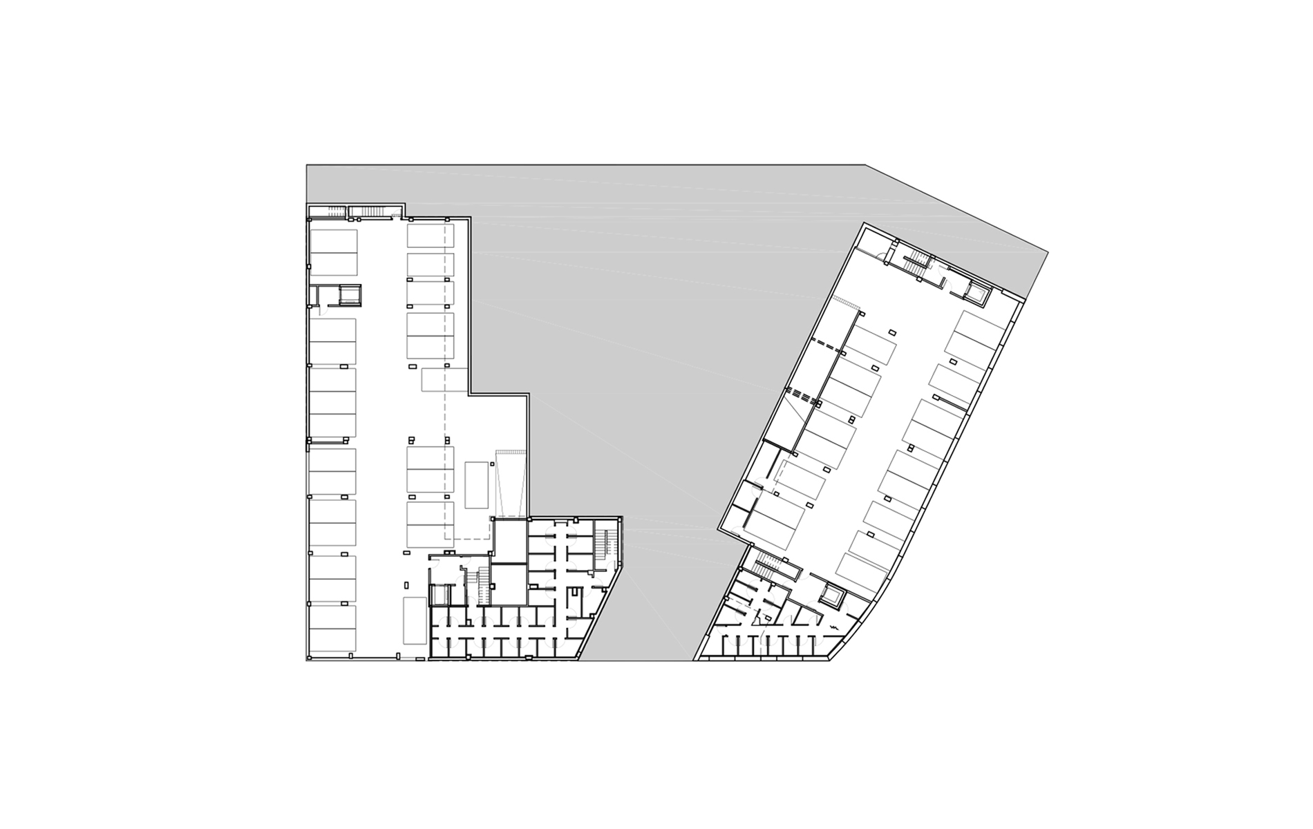 La volumetria del projecte consisteix en dos edificis separats, de 14 metres de fondària i cinc plantes d'alçada, situats en el perímetre d'una illa trapezoïdal i que comparteixen una zona comunitària en el pati d'illa.