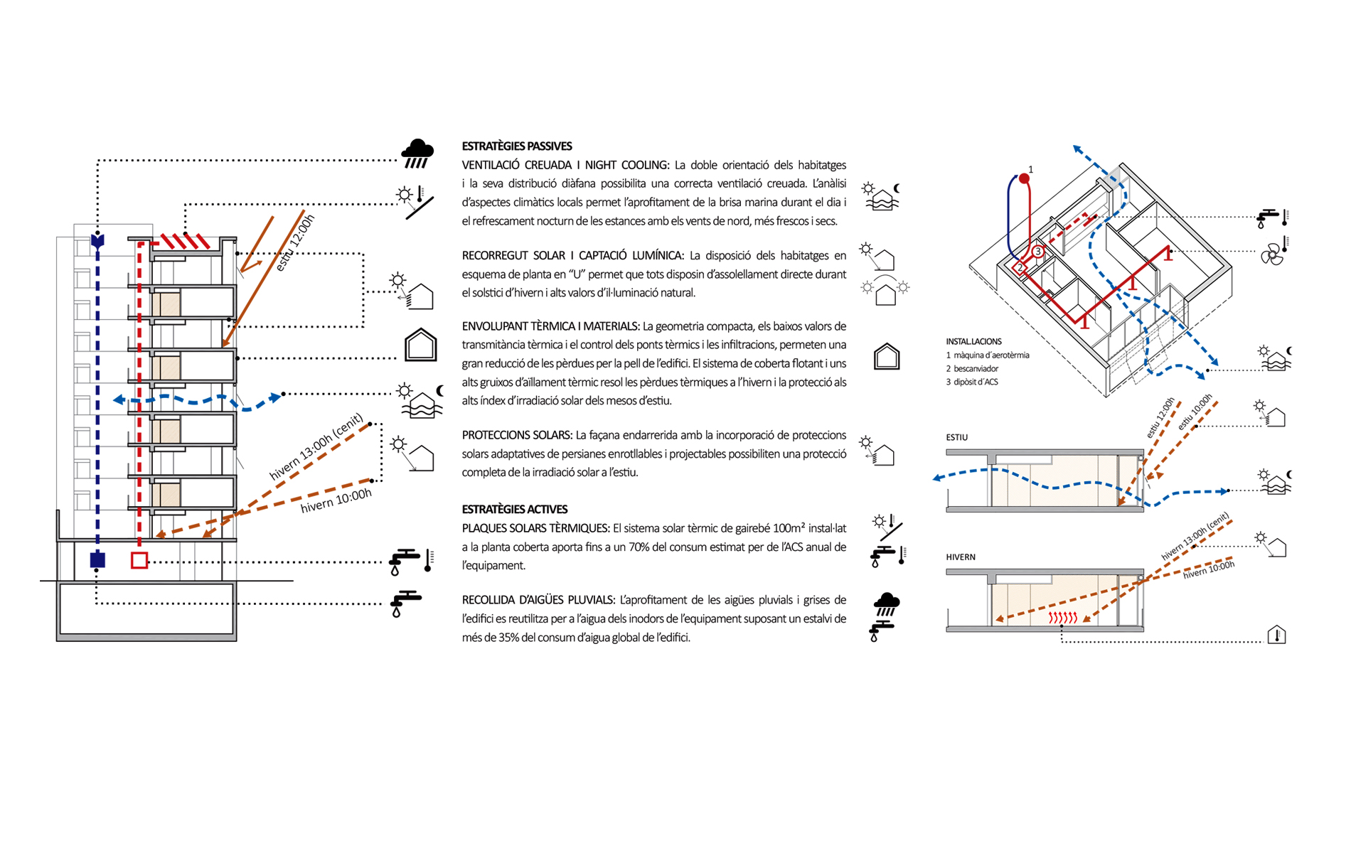 Pour atteindre un niveau de performance « nZEB », il s’agit de réduire la demande énergétique du bâtiment, tout en privilégiant les stratégies bioclimatiques passives globales. Celles-là naissent d’une analyse de la géométrie, de la forme et de la disposition du bâtiment et des logements sur le site. Des stratégies passives mixtes entre été et hiver permettent de réduire une grande partie des systèmes bioclimatiques actifs nécessaires pour aboutir à des valeurs de confort thermique tout au long de l’année.