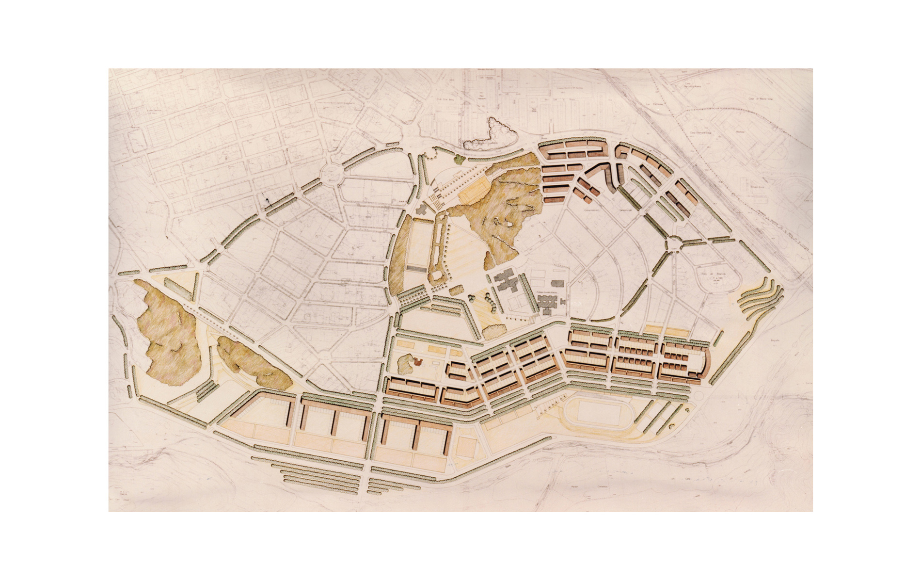 L’aménagement des constructions est conçu à partir d’une avenue principale de 50m de large, qui structure les différentes parties du nouveau quartier et qui s’intègre dans le réseau routier de base du noyau urbain. Les blocs sont alignés parallèlement à l'avenue et s’adaptent à la topographie et à l'espace disponible. À présent, le quartier est entièrement construit avec quelques modifications par rapport aux prévisions initiales.